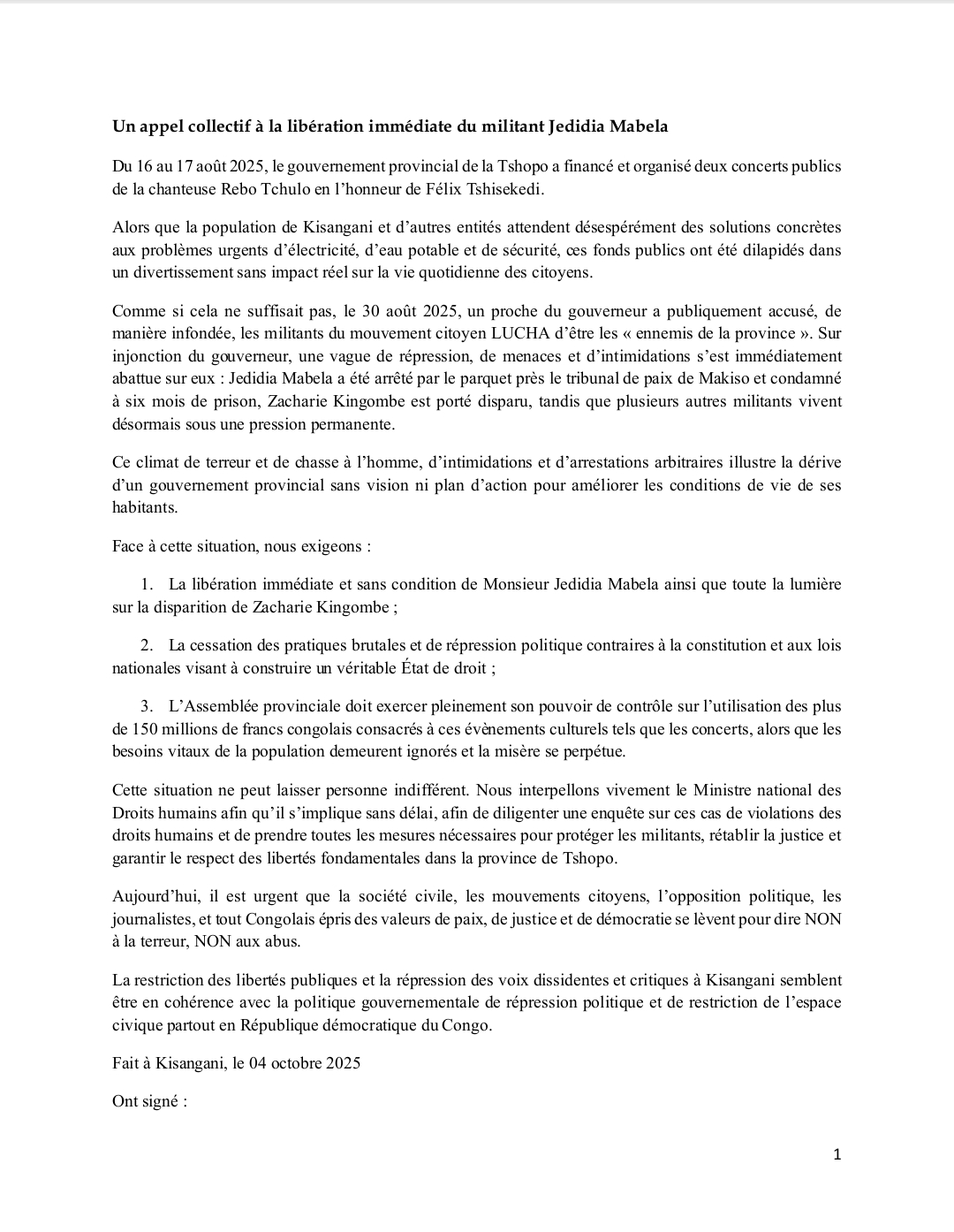 Un appel collectif à la libération immédiate du militant Jedidia Mabela