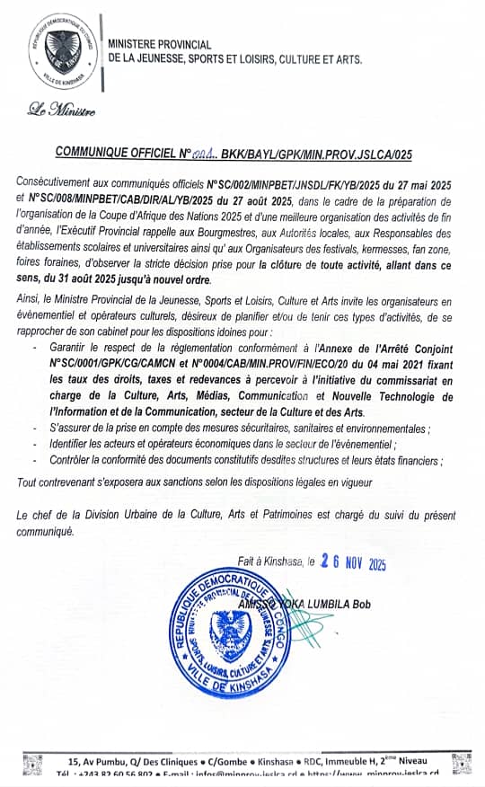 Festivités de fin d'année à Kinshasa : Le ministre provincial de la Jeunesse, Sports, Loisirs, Culture et Arts appelle les organisateurs au strict respect des dispositions légales (Communiqué)
